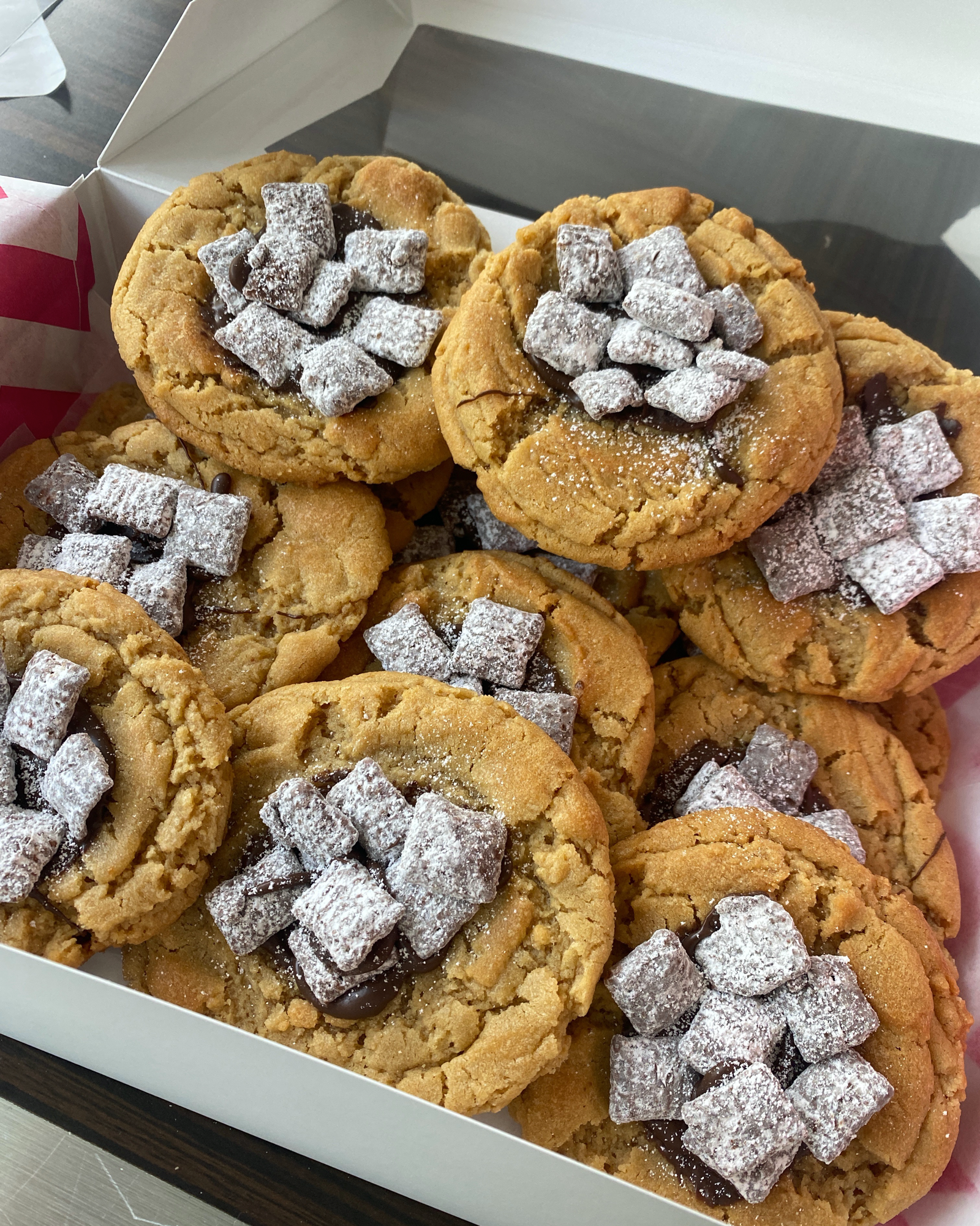 A soft and chewy peanut butter cookie topped with puppy chow swimming in a smooth and gooey chocolate.