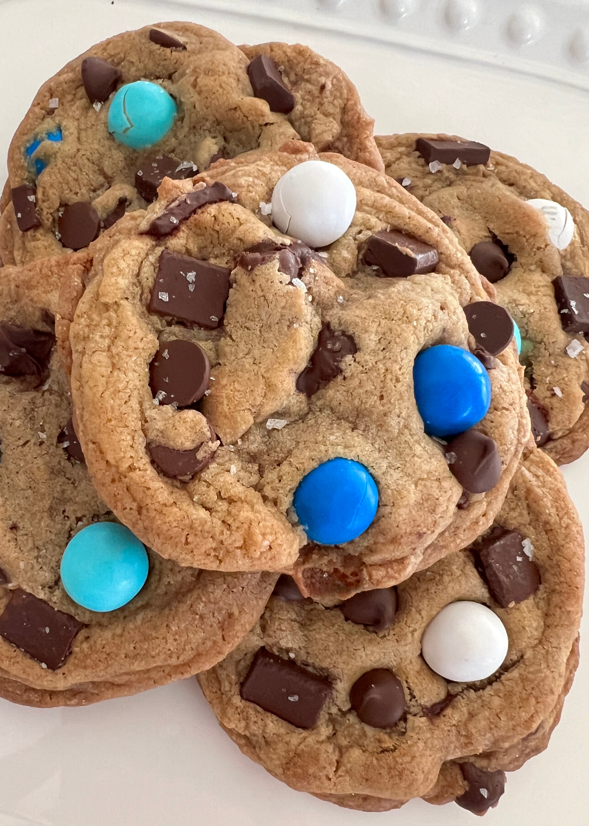 Hanukkah Chocolate Chunk Cookie Ingredients: Semi-Sweet Chocolate Chips, Milk Chocolate Chips, Pretzel M&M's, Sprinkles, Flour, Butter, Sugar, Brown Sugar, Egg, Vanilla, Baking Soda, Salt