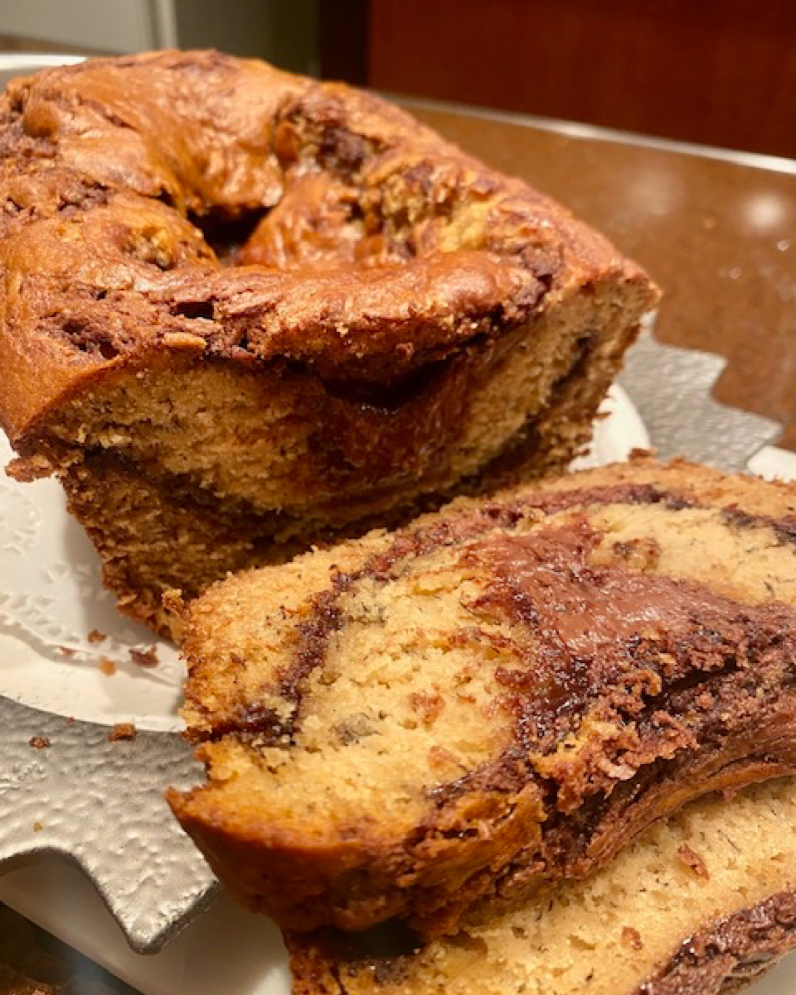 Banana Bread filled with delicious Nutella inside, topped with a Nutella drizzle.