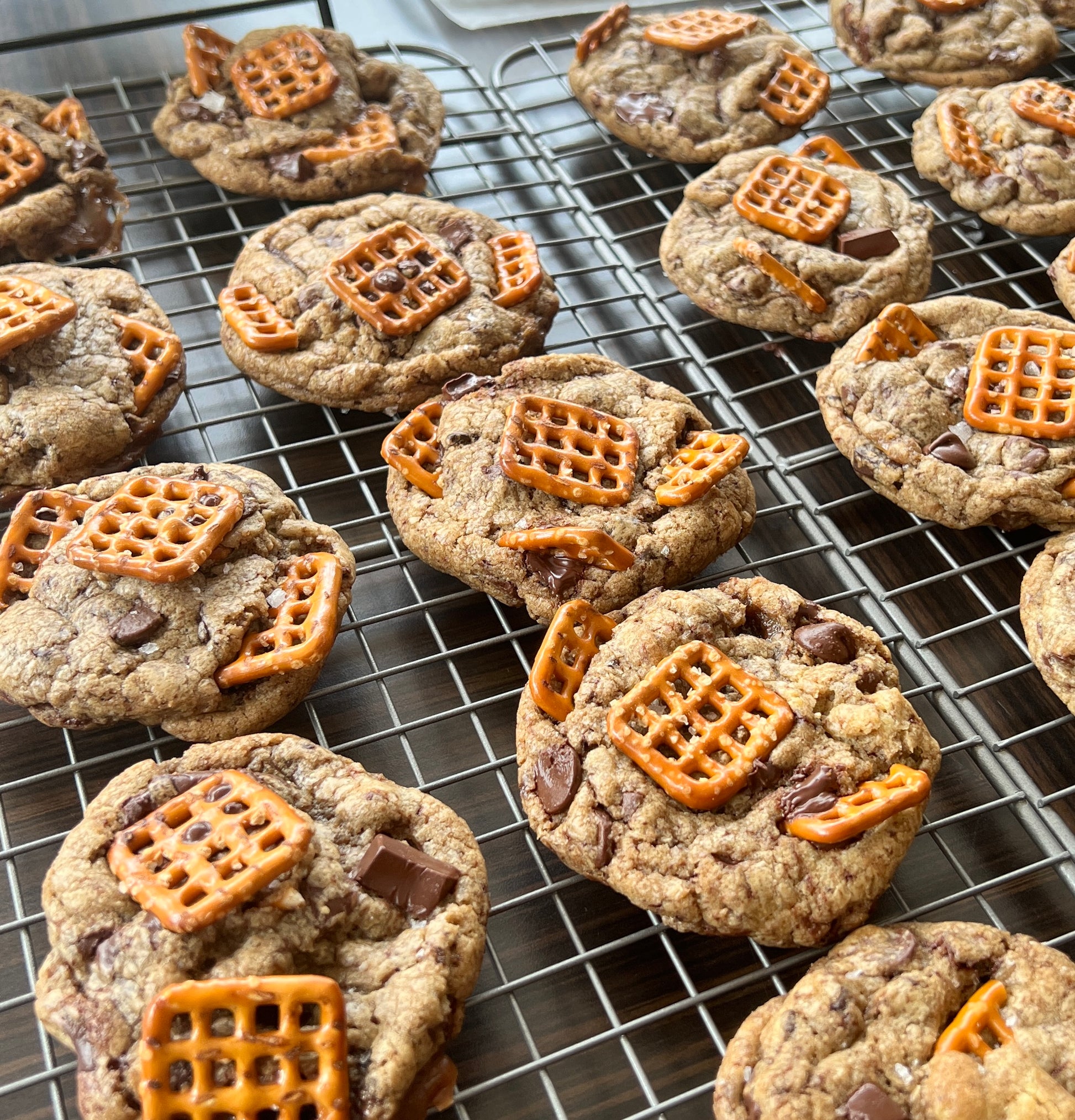Chocolate Chip/Pretzel cookie base plus caramel, chocolate chunks and topped with mini pretzel pieces.