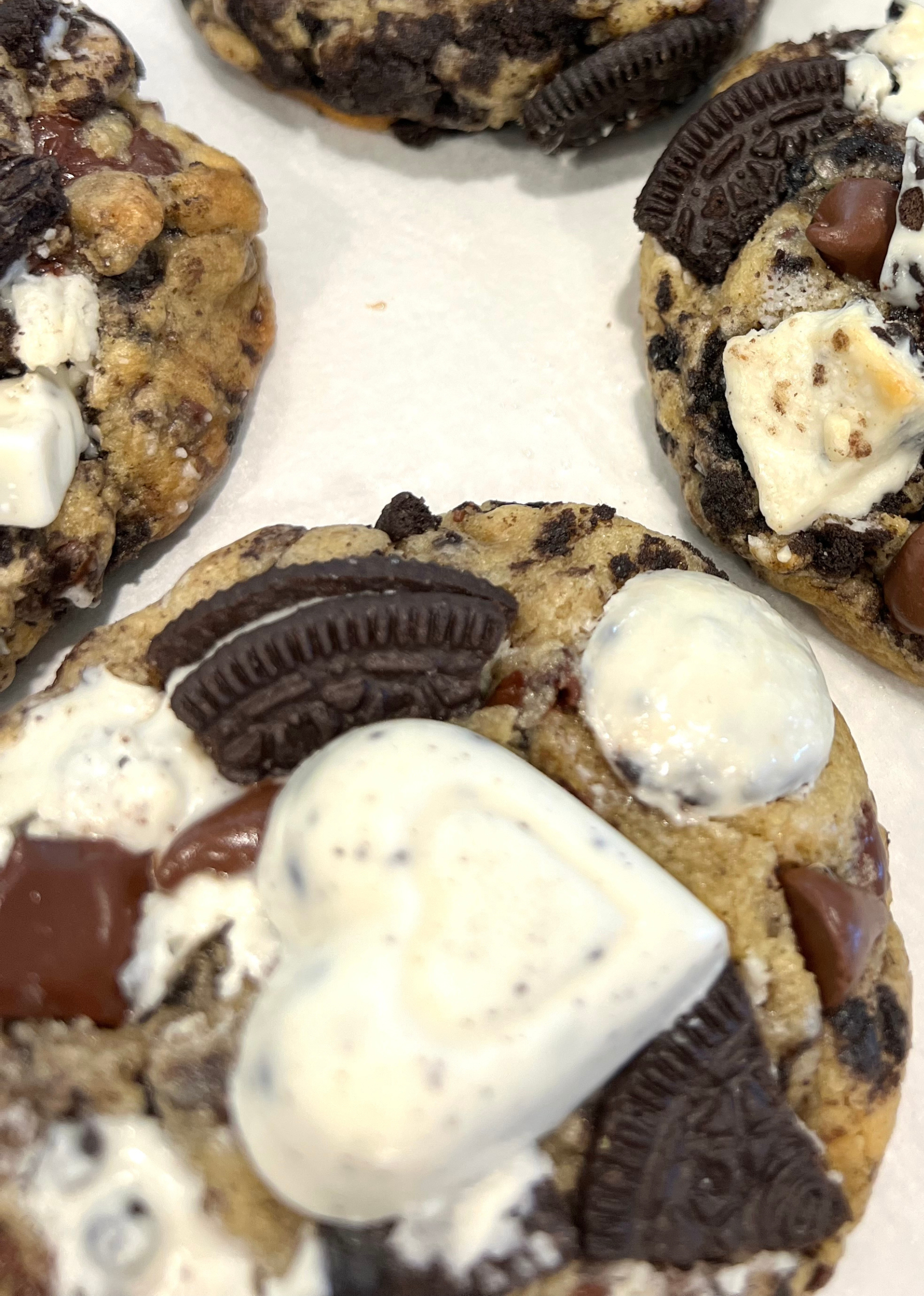 Cookies & Cream Cookie Ingredients: Butter, Cream Cheese, Sugar, Brown Sugar, Eggs, Vanilla, Flour, Baking Soda, Cornstarch, Salt, Oreos, White Chocolate, Chocolate Chips, Hershey's Cookies And Cream Bars and Drops