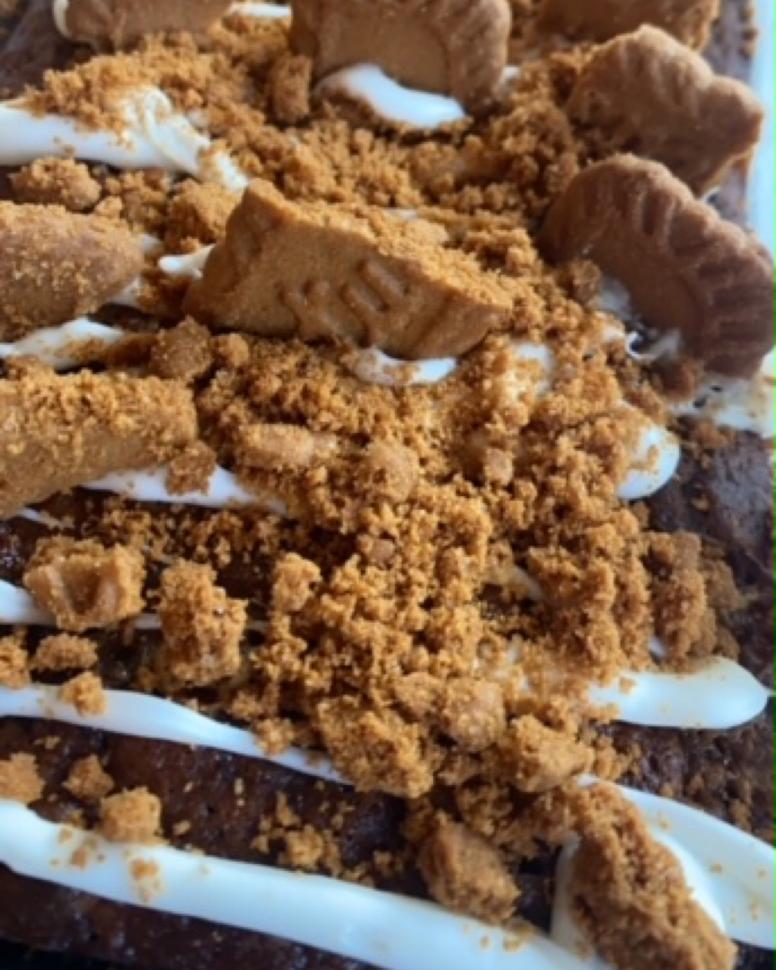 It’s like a a banana bread on steroids but instead it’s a bb stuffed with Biscoff Cookie Butter and crushed cookies. Then topped with more Cookie Butter and Biscoff cookie pieces. Topped off with a white chocolate drizzle.
